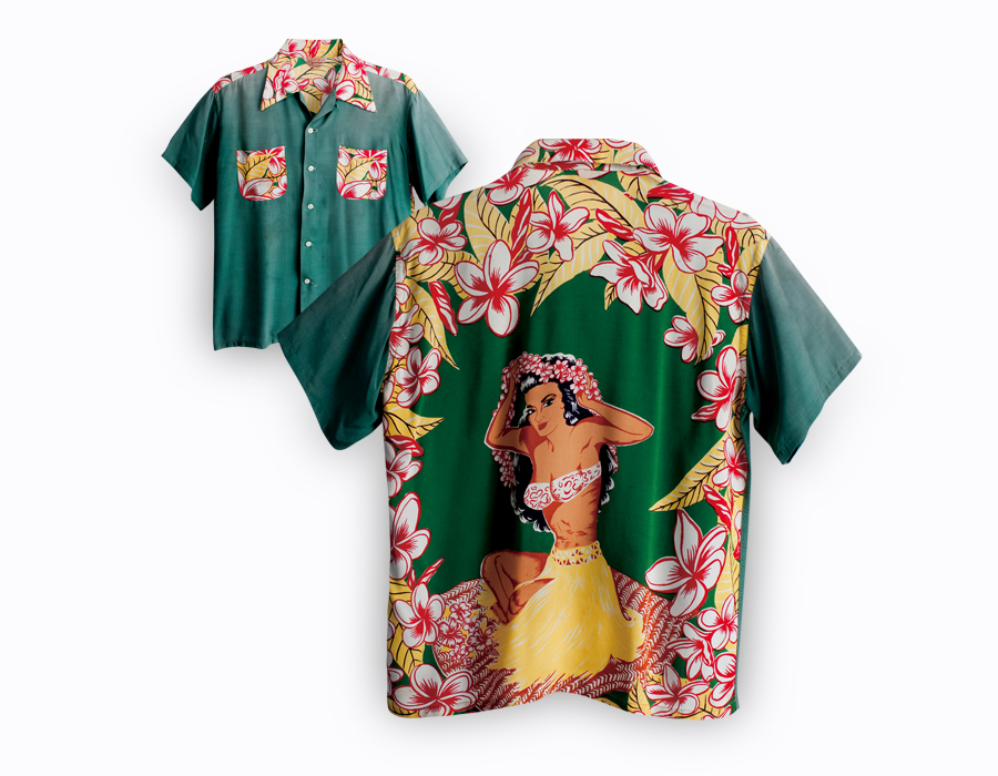 アロハシャツの絵柄やデザインパターンには、素材やプリント⽅法との相性、そして時代的な移り変わりがある。 アロハシャツ黎明期の1930年代に主流であったパターンが「オールオーバー・パターン」。 そのモチーフのサイズは年⽉を重ねるごとに徐々に⼤きくなっていき、 1940年代後期になると、より派⼿なデザインとして「ボーダー・パターン」の作品が多く⽣み出された。 そしてアロハシャツの最盛期である1950年代には、更に⾃⼰主張の強いデザインとして シャツ⾃体が⼀枚の画のように⾒える「ホリゾンタル・パターン」が⽣まれ、 ⽶国本⼟では「バックパネル・パターン」や 「ピクチャープリント」など、 より強烈なインパクトのあるデザインが作られるようになる。 ハワイならではのミックスカルチャーを象徴する オリエンタル・デザイン(和柄)は、 最初期のアロハシャツやオリエンタルブームが起こった1950年代に多く⾒られた。