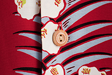 その美しさから「洋蘭の女王」とも称されるカトレア。ハワイアンキルトのモチーフにも使われ、ハワイではなじみの深い植物である。この作品は、カトレアの花と葉を縦方向にバランス良くレイアウトしており、数あるボーダー柄の中でも特に秀逸なデザインとして評価されている。〈ハワイアン・サーフ〉はパシフィック・スポーツウェア社のブランドで、デザインや仕立ての良さから当時の人気も高かった。